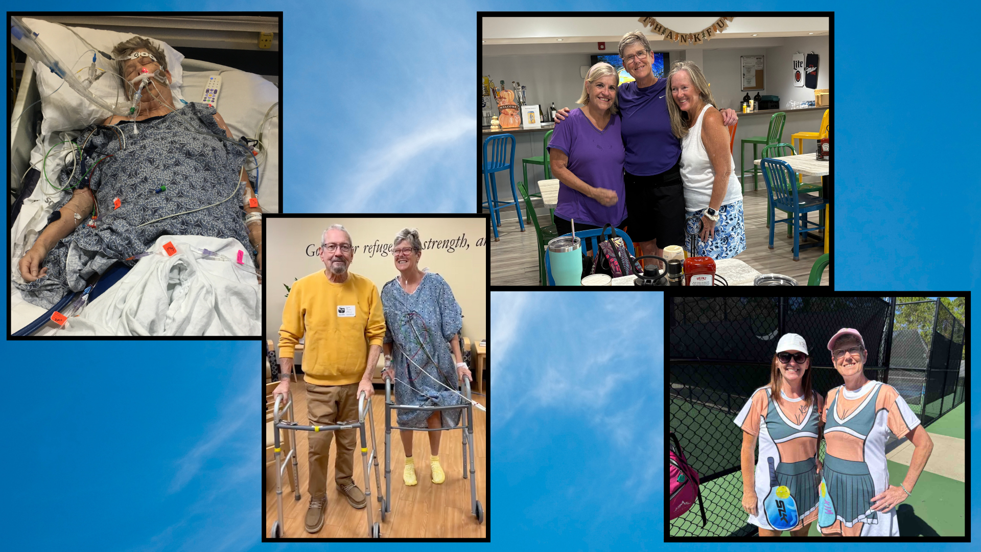That first night was touch and go and they were told that Kim had a “slim chance of making it through the first night.”  She did, and on the 3rd day they were warned that when Kim came off of life support, she may have signs of brain damage.  Against the odds, on the 5th day Kim was removed from life support and spoke for the first time.  Over the next few days Kim gained strength and learned about everything that her pickleball community had been taking care of on her behalf.  Jim’s knee was not healing properly and he was facing a possible second surgery.  Her pickleball angels stepped in and drove Jim back and forth from the hospital to appointments and took turns sitting by her side when he could not be there.  Kim woke up one day to Sylvia singing to keep her company!  Most fortunately, one the ladies on the pickleball court that day was a medical professional and stepped in to act as Kim’s health advocate.