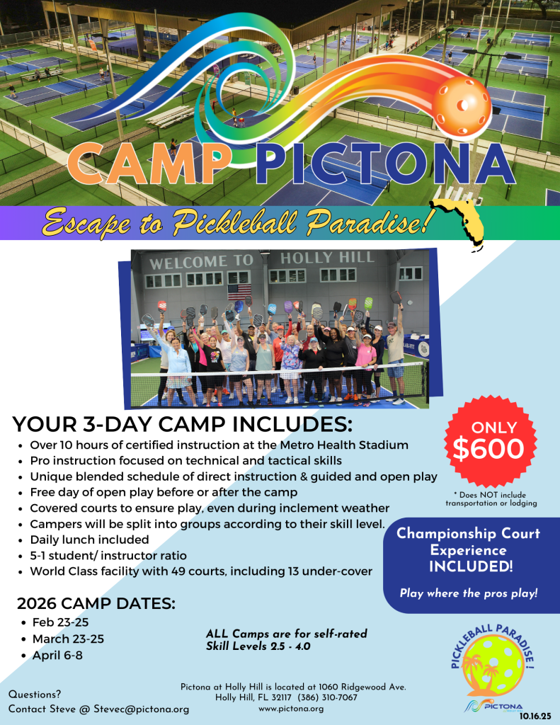 Pictona hosted the US Senior Pickleball National championships earlier this month with nearly 1000 seniors from across the country. We followed that with the PPA Daytona, where over 1200 players competed alongside the world’s top pickleball pros. The tournament also featured hundreds of juniors who displayed dazzling pickleball skills. Many of our members volunteered in various roles for these two tournaments which garnered praise and thanks from the USSP, PPA, the many players, and from all of us at Pictona.