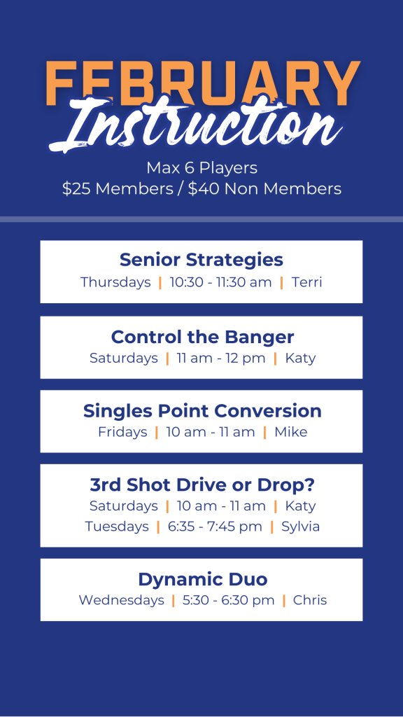 3rd Shot Drive or Drop?with Mary Burns Tuesday's from 5 - 6:30 Ready to take your game to the next level? Join our Instructor, Mary Burns, for the 3rd Shot Drive or Drop clinic. Whether you’re driving it to get a shorter 5th shot or dropping it softly into the kitchen to get the point back to neutral, this clinic will teach you when and how to make the right choice. Expect fast-paced drills, clear instruction, and plenty of fun as you sharpen your skills and consistency. Don’t just play, play smart! |